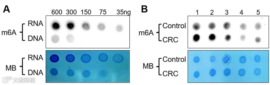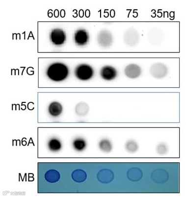 一种m1A, m7G, m6A和m5C点印迹检测试剂盒,用于定量RNA,尿液,血清,血浆或其他核酸样品中4种最常见的全局RNA修饰水平。