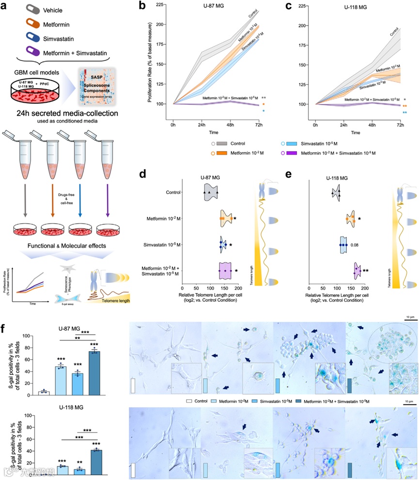 5、二甲双胍和/或辛伐他汀处理的细胞的条件培养基诱导GBM细胞的衰老和端粒伸长