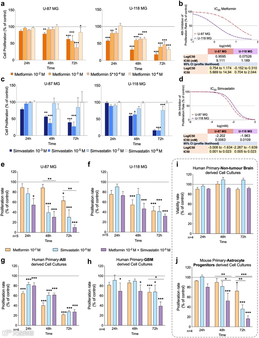 1、二甲双胍或辛伐他汀的治疗,特别是它们的联合治疗,降低了不同GBM模型的增殖率,但没有降低非肿瘤对照细胞的存活率