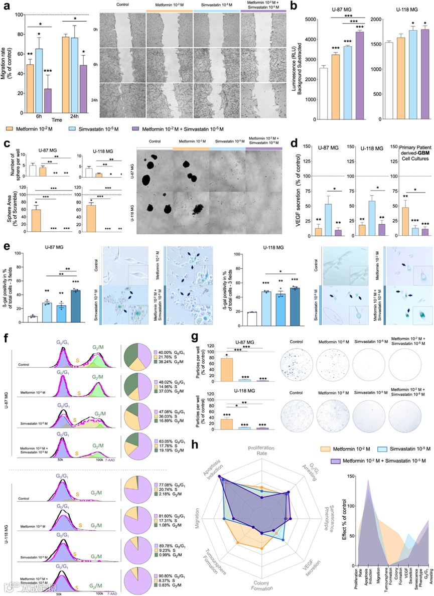 分别对二甲双胍、辛伐他汀和联合用药前后的GBM细胞的细胞迁移、细胞增殖、瘤体形成、VEGF分泌、衰老相关β半乳糖苷酶、细胞周期、集落形成进行了评估。结果表明,二甲双胍和辛伐他汀治疗会损害GBM细胞的进展,发育和侵袭性,从而在体外诱导衰老表型,并且通常当两种药物联合使用时,这些作用显着增强。