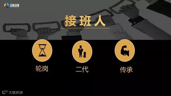 接班人现在的问题比较严重,就现在很多六零后七零后的小孩,特别是六零后,七零初的小孩逐渐开始到企业上班了,所以我们创创过去一年多的时间,在这块也花了不少的精力,辅佐七八十个二代,还有几个孩子进入我们公司在培养。培养二代,首先就是让他轮岗,让他在各种各样的岗位走一遍,让他了解。第二让这些二代直接传承一些东西,能够传承企业文化,对于这些人我们也要陪伴,当然不一定是指二代,团队也可以接班,比如美的,就是中国非常成功的职业经理人接班案例。