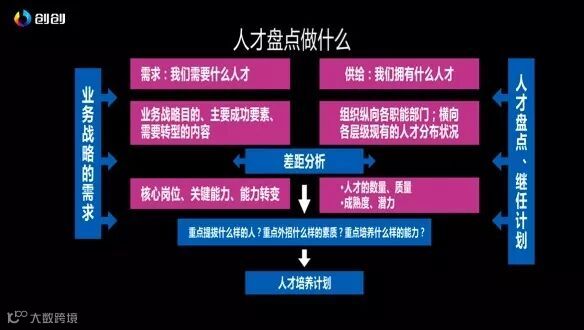 一张图就是人才盘点需要做什么,首先根据你的业务看看你需要什么样的人才。用这个来帮你做一些这个人才的盘点,最后做一些人才的落地的计划。大家可以打开这张图,认真研究一下,小公司就看你招什么样的人,大公司就看你裁什么样的人。这是非常有讲究的,这都是人才盘点,人家盘点既要招人又要这个才能。所以现在做企业,确实对老板要求很高,不只是要懂营销还要懂人才,所以大家要好好研究一下人才盘点。