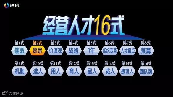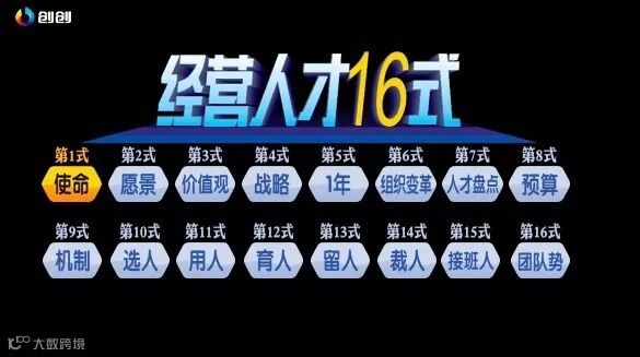 平时在课程现场这个课需要4天时间,现在可能大家一下子不能完完全全理解这里面的细节,但其实这几步都是环环相扣的,首先一个企业解决人才的问题要把企业的使命做出来,你到底是为自己活,还是为员工活。第二个你的愿景不能只有自己的目标,还要有员工的目标。第三个你要给员工一个方向,要有价值观,有了这些东西之后,你要定公司的战略,用战略来承接使命、愿景、价值观。把这些定好之后你要开始定你公司一年的目标,有了目标之后,根据公司的业务变革组织架构,有了组织架构,你开始盘点公司的人才,盘点之后,再反过来推动公司的组织架构,彻底实现公司一年的目标,其实这十六式,是非常严谨的,非常有逻辑性的。