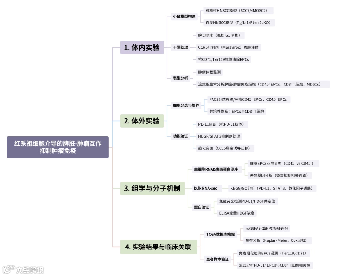 在本研究中,多组学技术的应用为深入理解红系祖细胞(EPCs)在脾脏-肿瘤相互作用中的作用机制提供了全面的数据支持,揭示了EPCs在脾脏与肿瘤相互作用中的重要作用,以及其对全身和局部抗肿瘤免疫反应的负面影响。通过靶向EPCs,可恢复抗肿瘤免疫反应,提高免疫检查点阻断治疗的效果,为开发更有效的癌症免疫治疗方法提供了新的思路和靶点。未来的研究可以进一步探索EPCs在其他类型癌症中的作用,以及开发针对EPCs的特异性治疗策略,以改善癌症患者的预后。