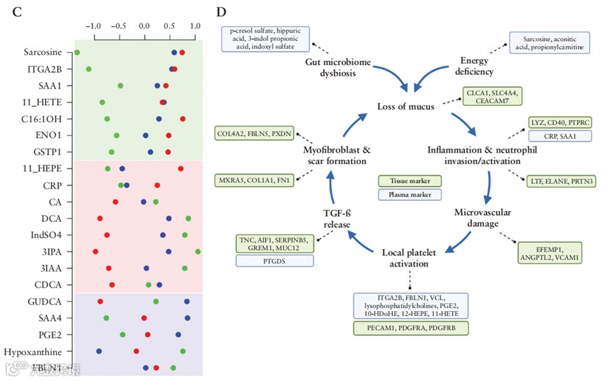 通过对健康对照、急性UC患者和缓解期UC患者的血浆样本进行蛋白质、类二十烷酸和代谢物的分析,发现急性UC患者的血浆中多种炎症标志物和血小板相关蛋白上调。类二十烷酸分析进一步支持了血小板在UC中的系统性参与。代谢组学分析显示,急性UC患者的血浆中多种氨基酸和胆汁酸下调,而肠道微生物衍生的代谢物也显著减少。这些变化可能与线粒体应激和氧化应激有关。