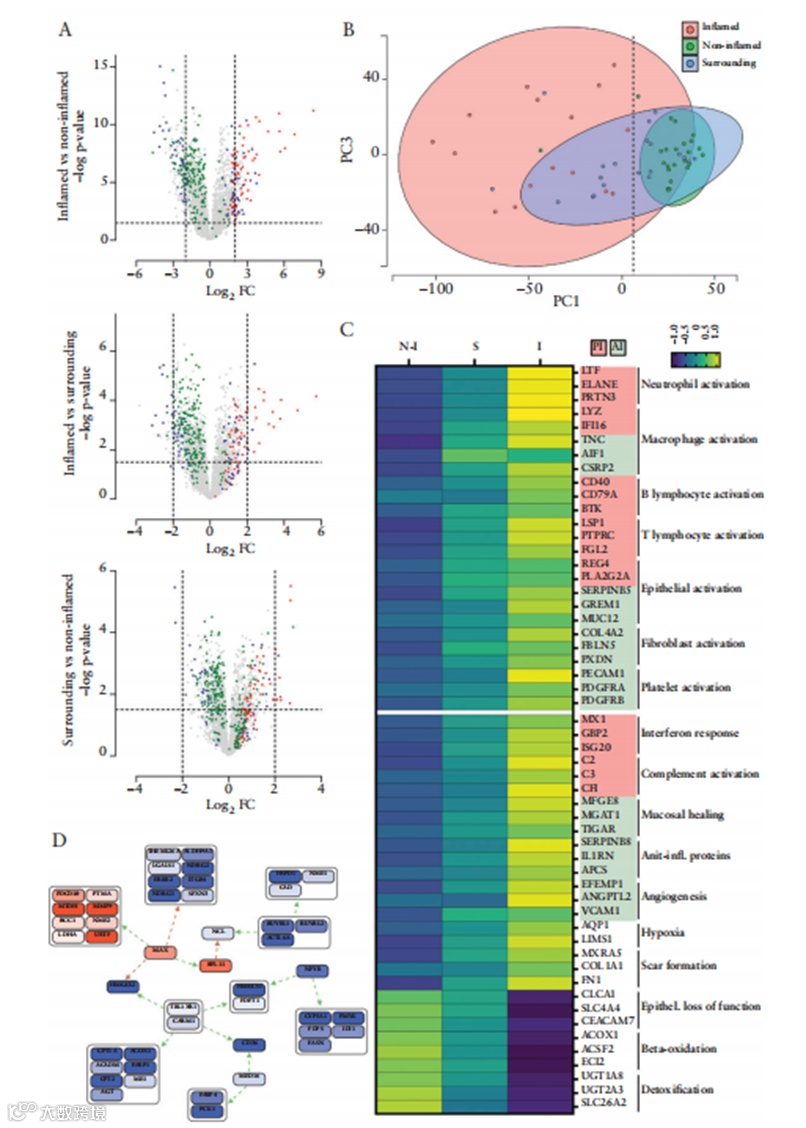 通过对60个组织活检样本的分析,鉴定出4579种蛋白质,并发现炎症组织中许多与中性粒细胞、巨噬细胞、B细胞、T细胞、成纤维细胞、内皮细胞和血小板激活相关的蛋白质上调。此外,炎症组织中线粒体蛋白质普遍下调,表明能量代谢受损。研究还发现,炎症组织中许多抗炎蛋白和促进伤口愈合的蛋白也上调,提示血小板衍生的TGF-β可能在抗炎过程中起重要作用。通过因果路径分析,研究还发现代谢关键转录因子MAX在炎症组织中可能起到枢纽作用。