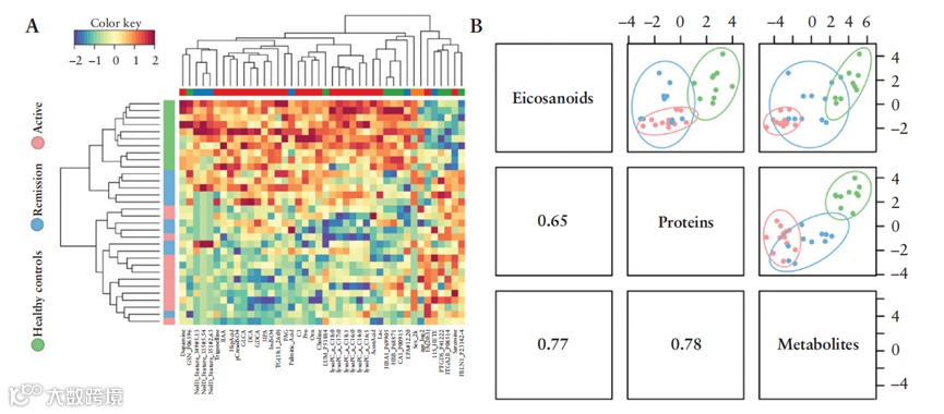 数据整合:使用DIABLO方法整合蛋白质组、代谢组和脂质组数据,鉴定与UC相关的多组学生物标志物。