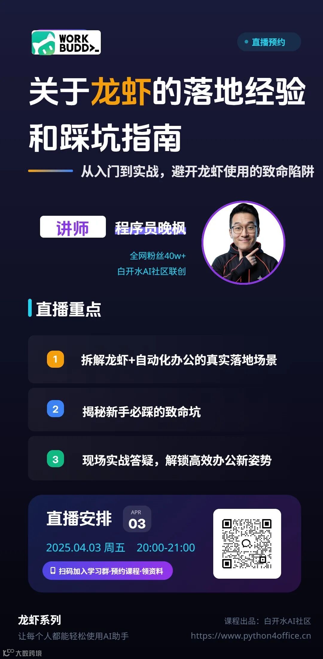 直播全程开放答疑!不管你是龙虾部署遇到了问题,还是WorkBuddy发票识别卡了壳,甚至是其他自动化办公的难题,都可以在直播间提问,晚枫老师现场给你拆解、给方案,针对性解决你的痛点。