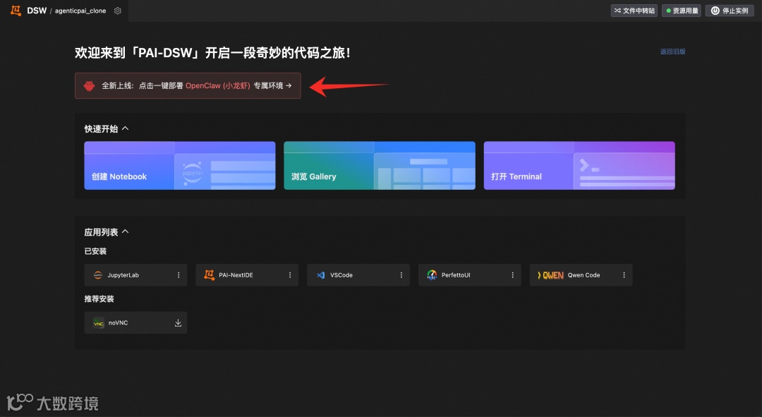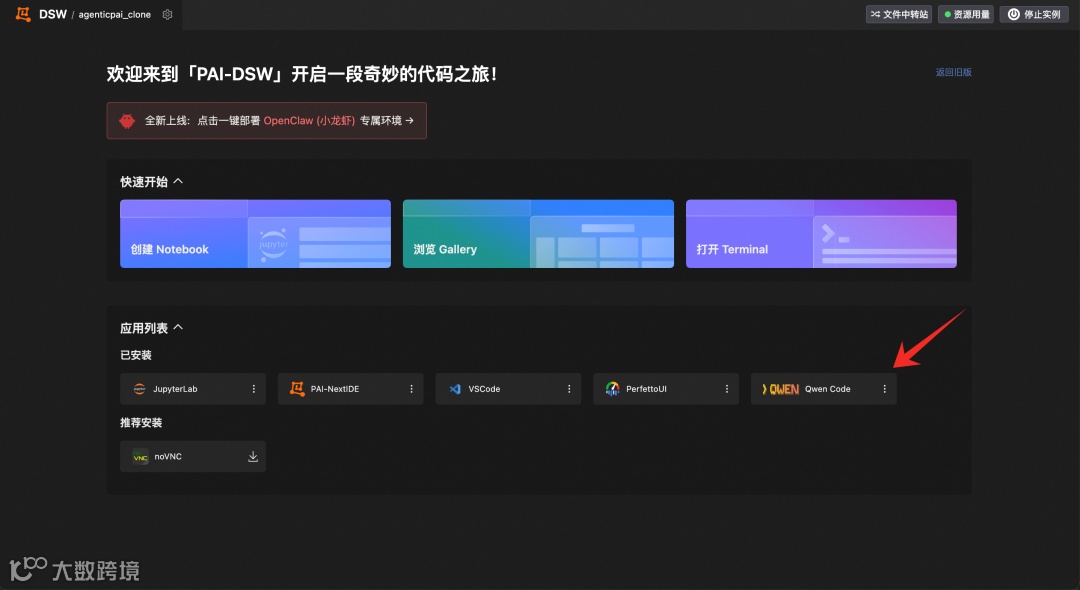 创建完成后点击打开,进入 DSW 开发环境
