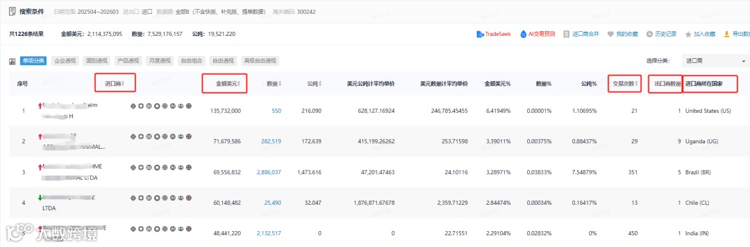 2025年4月-2025年3月,进口商公司名称,金额,交易次数,供应商数量,进口商所在国家。