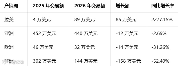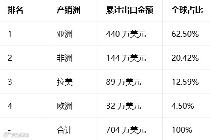 :亚洲为绝对核心市场,贡献超 6 成出口额;非洲为第二大市场,但份额较上年同期大幅收缩;拉美市场实现爆发式增长,成为核心增量来源。