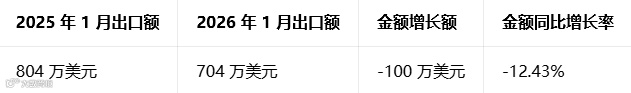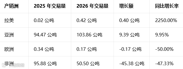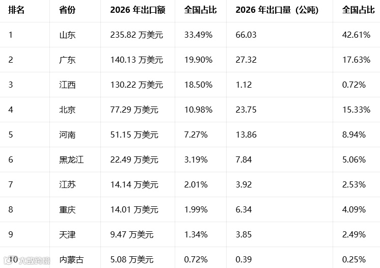 :同比增速 100%,为 2026 年 1 月新增出口省份,实现从 0 到 1 的突破,交易额 14.14 万美元,交易量 3.92 公吨,增长潜力大。