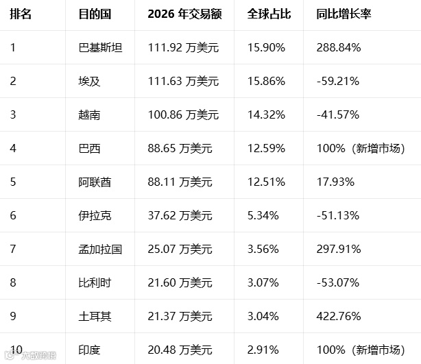 :泰国(交易量同比 - 99.63%)、埃及(金额同比 - 59.21%)、越南(金额同比 - 41.57%)、伊拉克(金额同比 - 51.13%)等东南亚、非洲传统核心市场出现显著份额流失,是整体出口量下滑的核心原因。