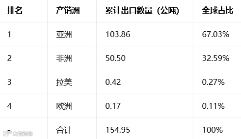 :亚洲、非洲合计贡献 99.62% 的出口量,是核心走量阵地;拉美、欧洲出口量极低,但出口单价远超亚非市场,属于高附加值蓝海市场,其中拉美单吨出口价超 21 万美元,是亚非市场的 50 倍以上。