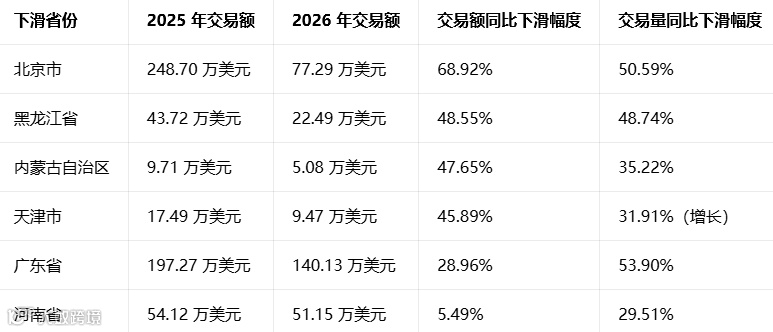 按交易额同比下滑幅度从高到低排序,核心下滑省份如下: