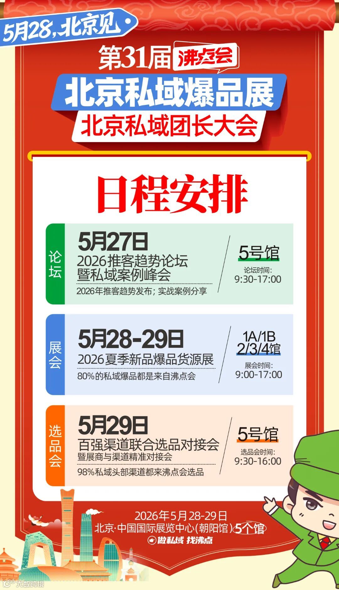 2026华北私域顶流盛会——第31届沸点会正式定档,5月28日-29日,将在北京·中国国际展览中心(朝阳馆)举办,聚焦私域全链路资源对接,帮你一站式打通北方市场,抢占年中旺季先机。