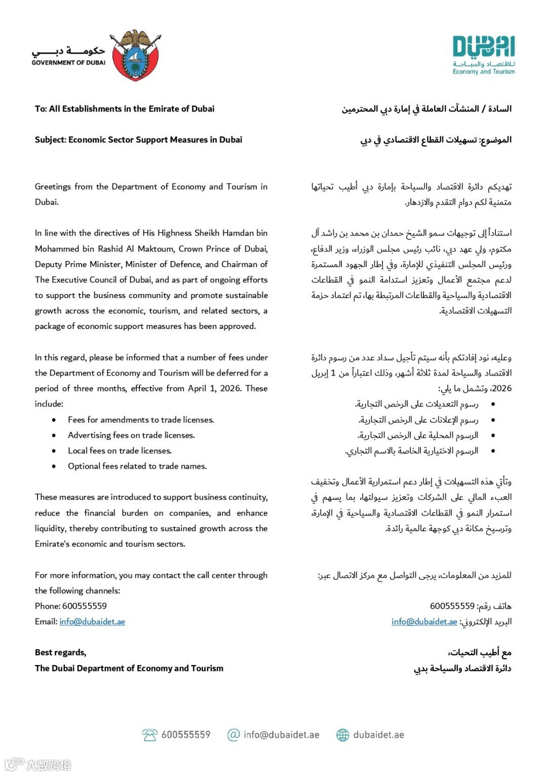 近日,迪拜经济与旅游局(DET)发布了一项针对企业的重要经济支持措施:自2026年4月1日起,部分商业执照相关费用将实行为期三个月的延期收取。这是继此前10亿迪拉姆企业扶持计划之后,迪拜政府再次出手,为在迪拜经营的企业减轻短期财务压力。本文将为您解读政策要点,并分析对出海企业的实际影响。
