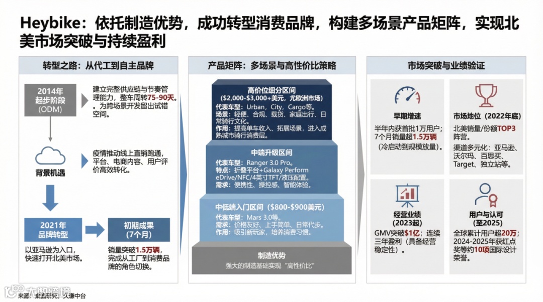 2022年至2023年,Heybike通过多元化渠道布局确立了经营稳定性。在稳固亚马逊地位的同时,品牌逐步铺开沃尔玛、百思买、Target及独立站渠道。2023年,品牌GMV突破1亿美元,并保持了连续三年的盈利状态,显示出在规模扩张之外极强的财务健康度。