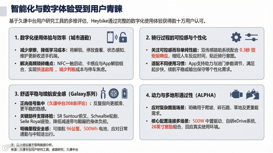 Heybike的市场优势并非源于单一的硬件参数竞赛,而是将电动自行车转化为一套完整的数字化使用体验。久谦中台 · 用户洞察分析系统的用户满意度调查显示,Heybike所以受到数十万用户青睐,核心在于其对产品生命周期的深度重构。