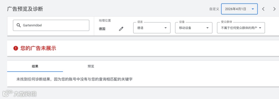 如果你发现广告在“广告预览工具”中没有展示,很可能是因为选择的关键词与搜索词不匹配。例如,如果广告设置了精准匹配关键词“garden furniture supplier”,而你在预览中搜索了“cheap outdoor chairs”,那么广告就不会被触发。