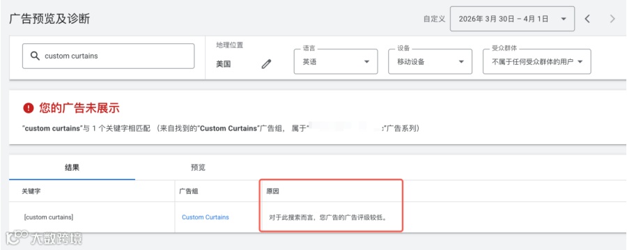 有时广告会因为出价过低而未能参与竞价,导致无法展示。你可能在“广告预览工具”中看到提示:“您的广告未展示(排名)”。