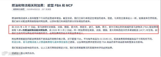 亚马逊欧洲站自4月17日起,针对英国、法国、德国、意大利、西班牙等十个欧洲站点FBA配送费统一加收1.5%燃油和物流相关附加费,5月2日MCF多渠道配送同步执行。此举源于红海危机与地缘冲突持续推高海运、仓储成本,叠加欧洲消费疲软,跨境卖家利润空间受到严重挤压。