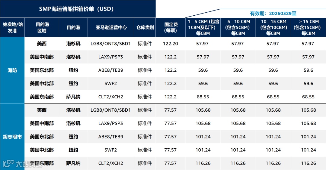 3) 报价不含关税、保险费、商检费、海关查验费及其他客户原因产生的费用。所有服务属亚马逊全球物流国际货运代理服务组成部分,分仓优选(SMP)不收取FBA入库配置服务费(含超大超重件)。