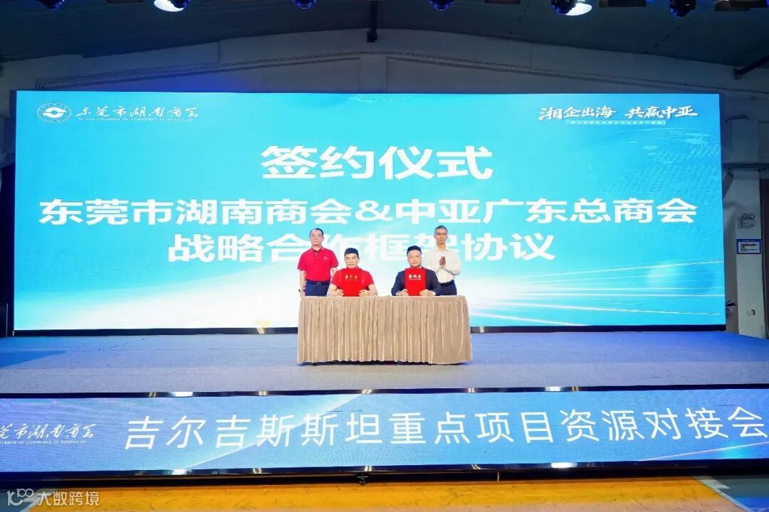 中亚广东总商会执行会长洪国权和东莞市湖南商会会员秦哲理分享了吉尔吉斯斯坦投资环境及实操经验。东莞市湖南商会与吉尔吉斯粤商会签署战略合作协议,建立湘企进入当地市场的绿色通道,尹效良等见证签约。