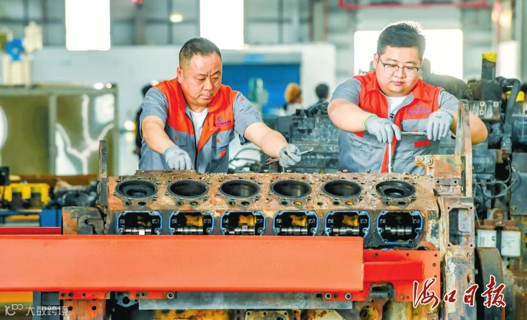 海口综保区内,工作人员加紧维修境外矿卡柴油发动机。海口市融媒体中心记者康登淋摄