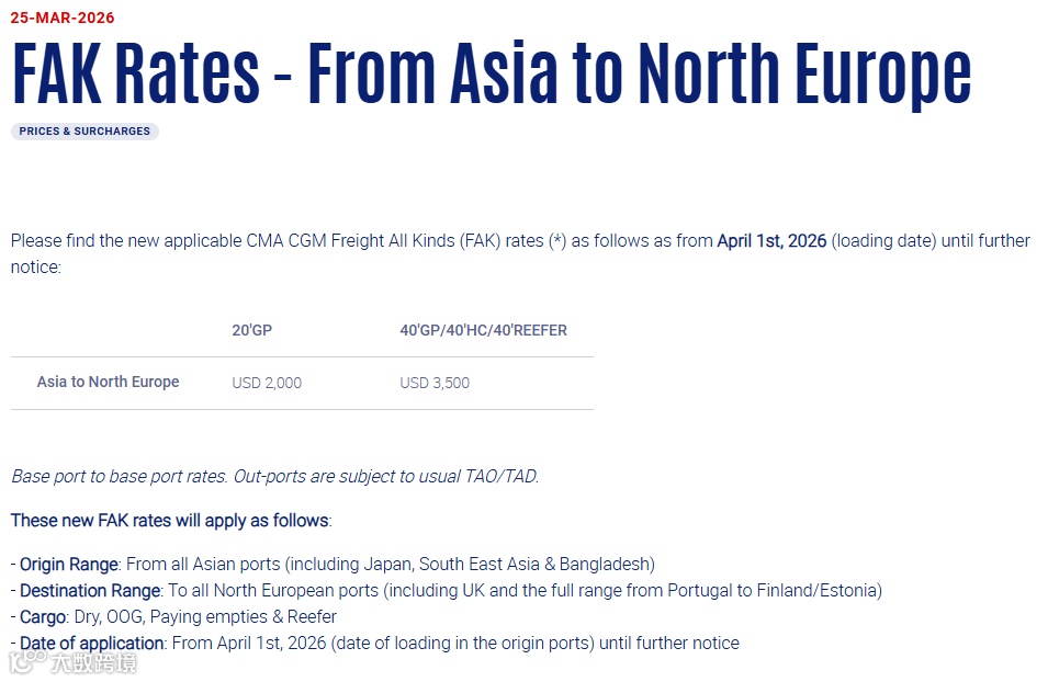 亚洲至北欧航线FAK调整