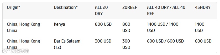 - 中国及香港始发至肯尼亚:20尺柜800美元、40/45尺柜1400美元