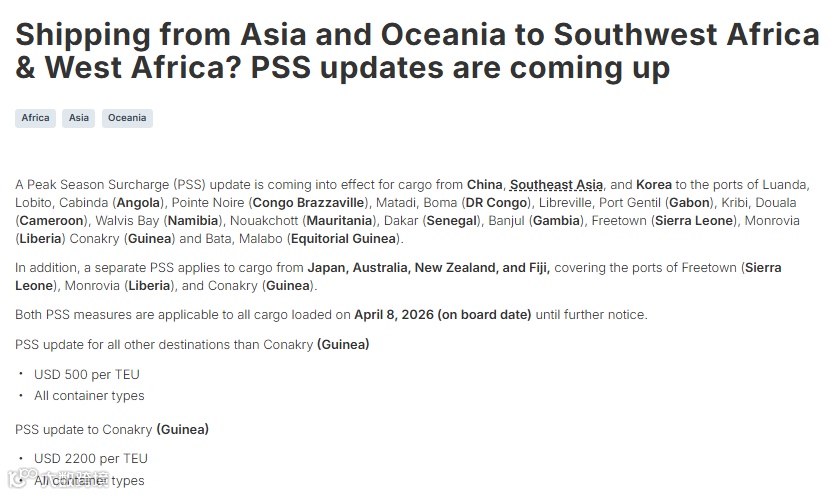 日本、澳新等发往科纳克里航线额外执行。2026年4月8日起装船货物生效。