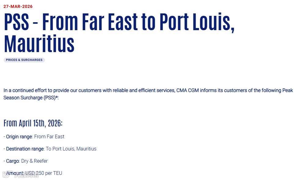 远东至毛里求斯路易港:250美元/箱,2026年4月15日起生效。