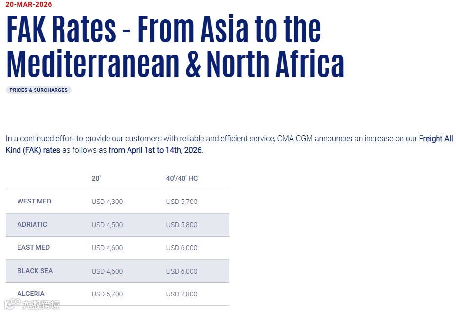 亚洲至地中海航线FAK调整