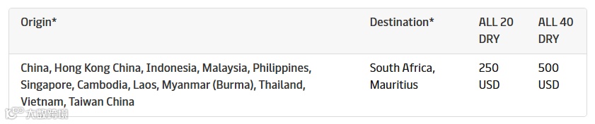 中国及东南亚十地始发至南非与毛里求斯航线:20尺柜250美元、40尺柜500美元,4月6日起生效。