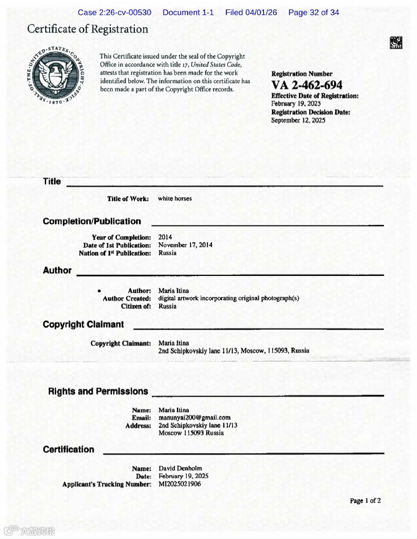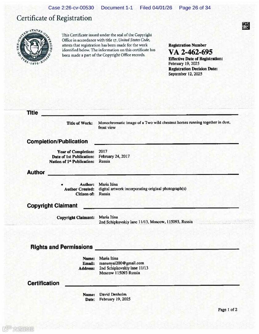 2026年4月1日,一起版权侵权案件在美国宾夕法尼亚州西区联邦法院(Pennsylvania Western District Court)提起,案号2:26-cv-00530。本案类型为版权侵权,当前状态为Open(进行中),由Ference & Associates律所代理。