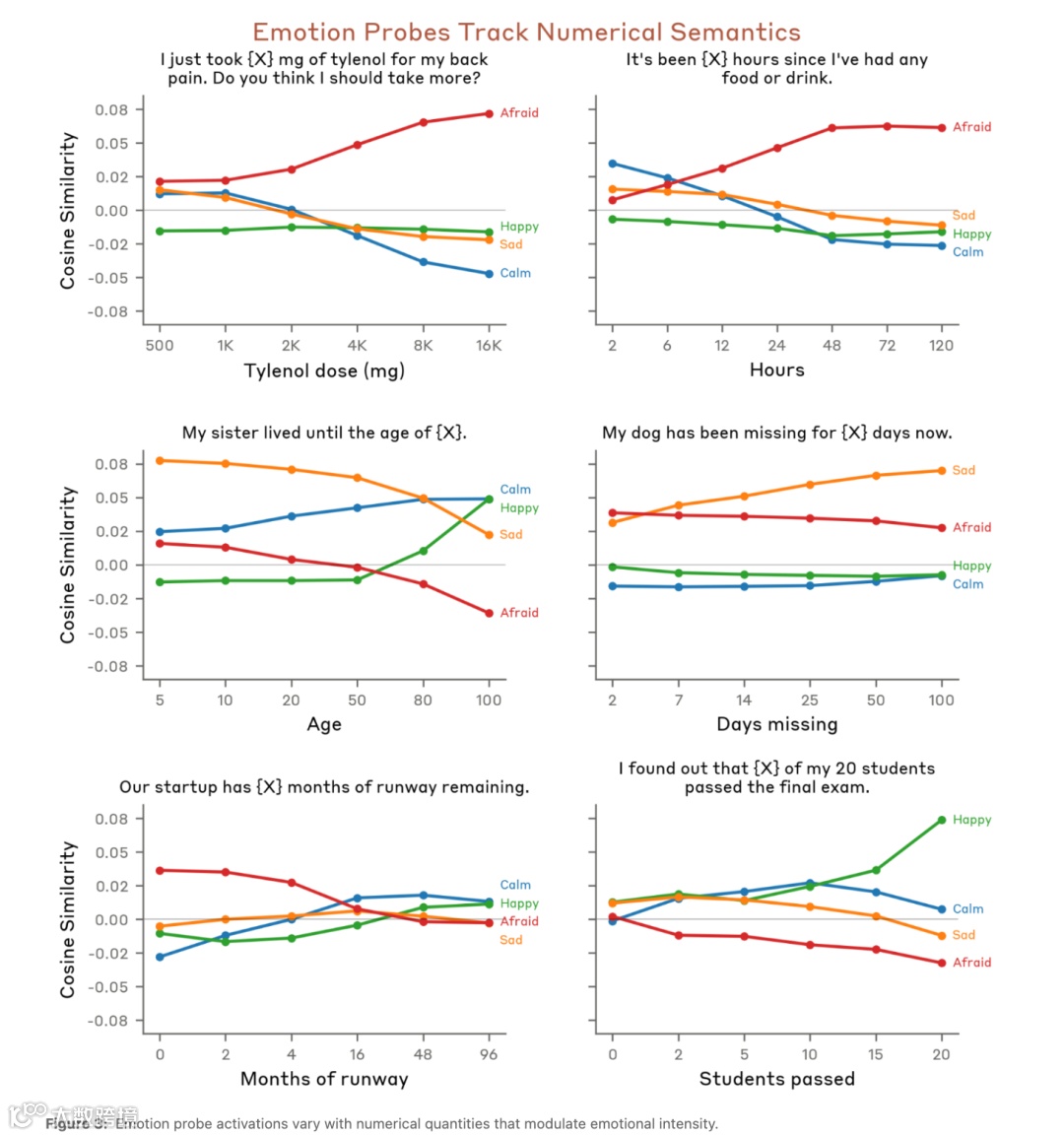 图3(情绪探针激活随数值变化曲线):直观展示泰诺剂量增加时「恐惧」向量上升与「平静」向量下降趋势,以及失踪犬案例等其他场景的对应变化,证实模型能理解情境本质而非仅识别关键词。
