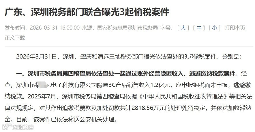 近期,广东、深圳税务部门联合曝光3起偷税案件。其中,深圳3C大卖深圳市森松尼电子科技有限公司因通过私人账户隐匿1.2亿元销售收入,被追缴税款、罚款及滞纳金共计2818.56万元。因涉嫌逃避缴纳税款罪,案件已依法移送公安机关,相关责任人面临刑事追责。