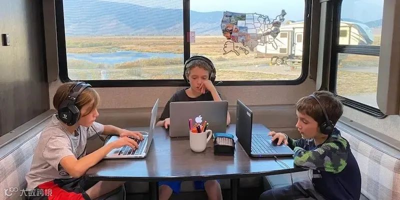 下图是公路旅行的一家,孩子们在房车上学习,这也有个专门的英文词描述:roadschooling。