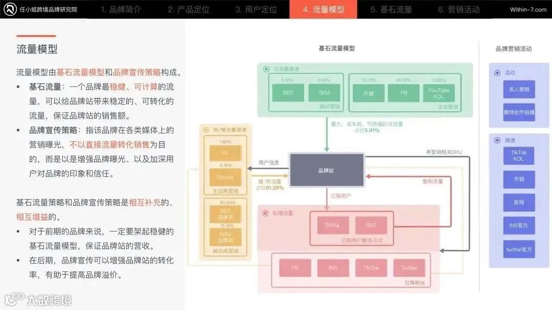 大家可以看一下TRIANGL的流量模型,冷流量占比是5.91%, 主要以外链、FB广告 、 YouTube KOL 这类主动营销为主。