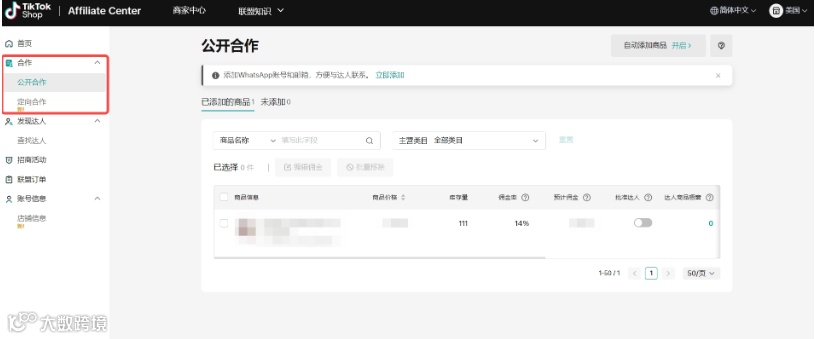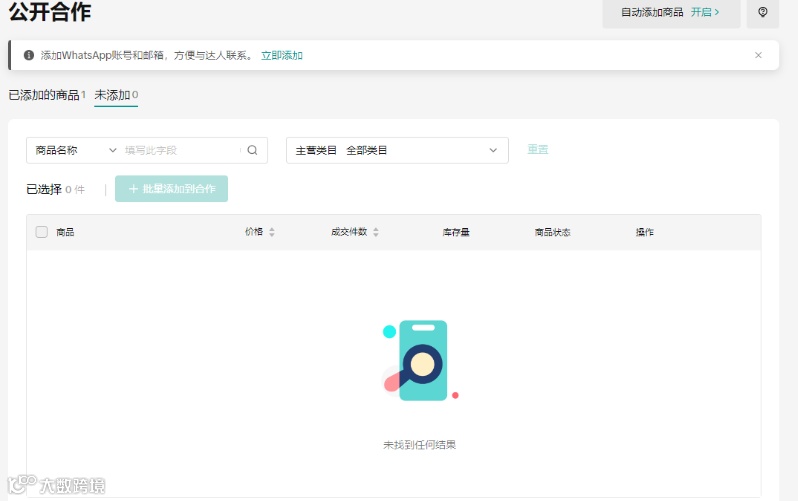 - 在公开合作页面,“已添加的商品”和“未添加”标签页中选择商品。