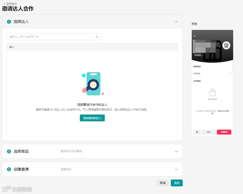 - 填写佣金、结算方式等信息,发送合作邀请。