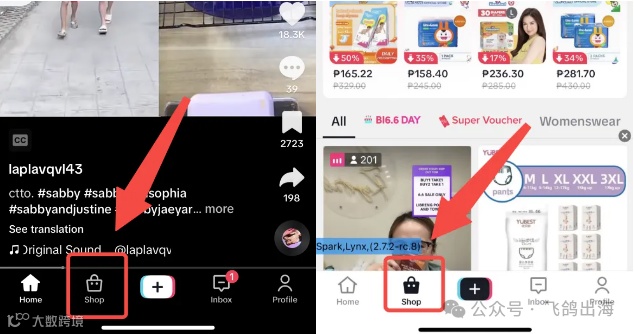 - 查看底部导航栏,点击“购物袋”图标🛍️进入TikTok Shop。