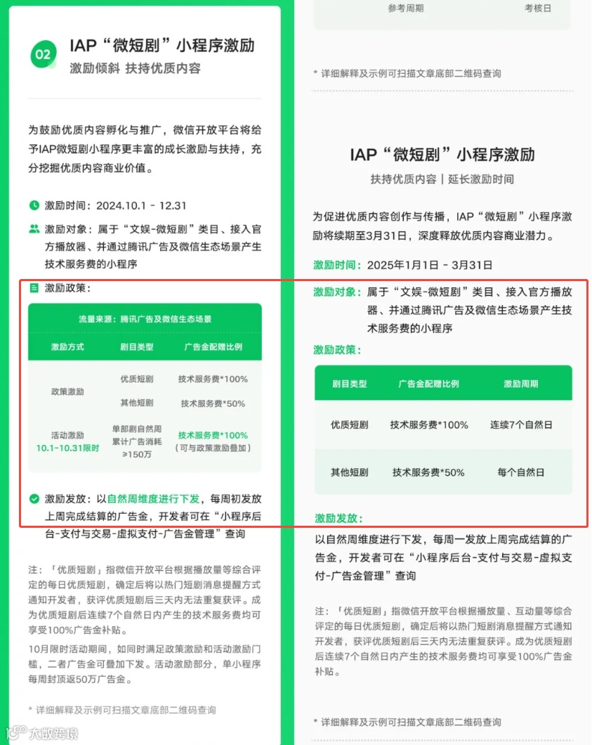 12月26日,微信官方发布了2025年第一季度新一轮的激励计划,宣布自2025年1月1日起,微信开放平台联合微信广告针对“微短剧 & 小说”相关小程序激励活动再次加码,活动持续至3月31日。