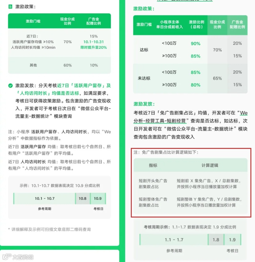 - 增加了对免广告剧集数占比的考量,同时上调部分“现金分成比例”及“广告金配赠比例”,达标小程序最高可获分成前变现收入90%的激励。