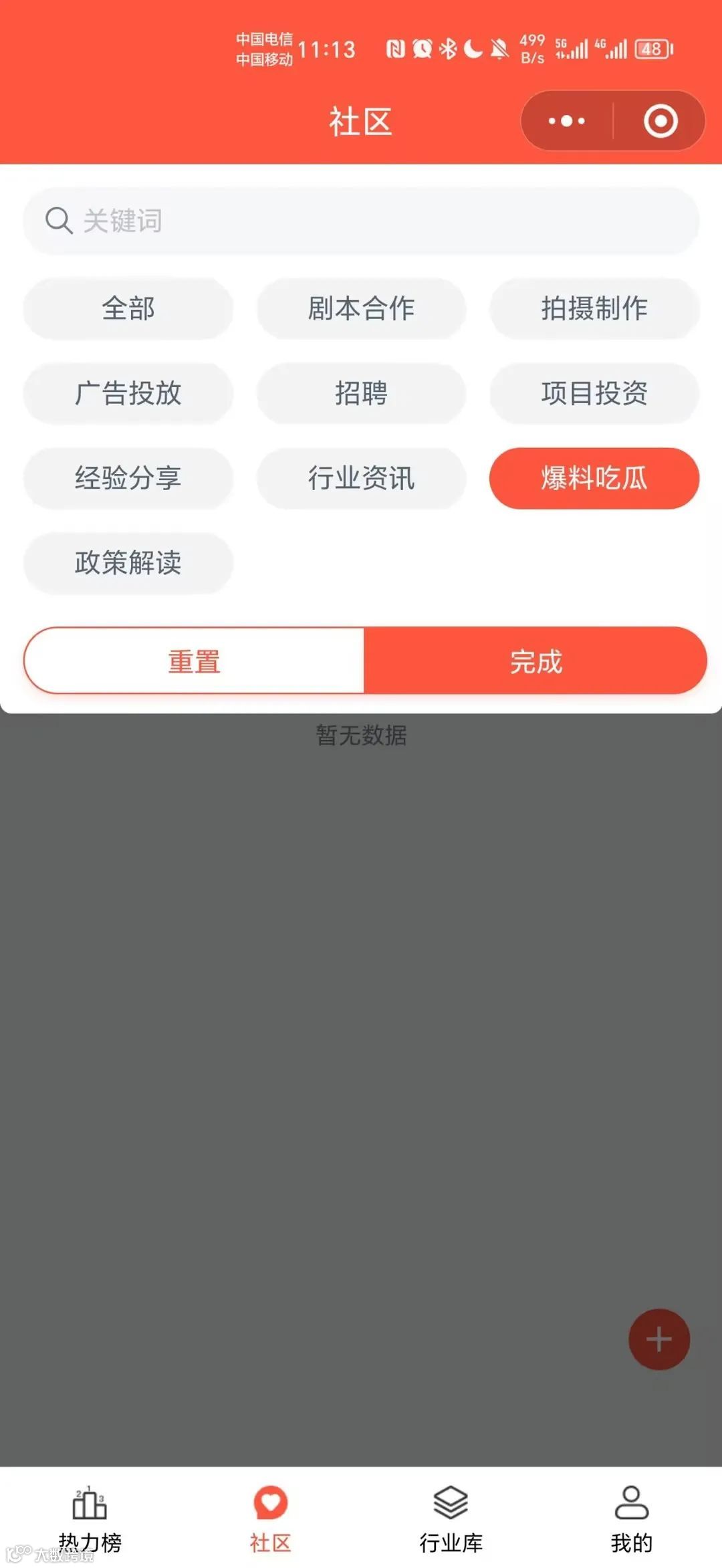 更新后,剧查查小程序主要包括三大板块:热力榜、行业库和社区。