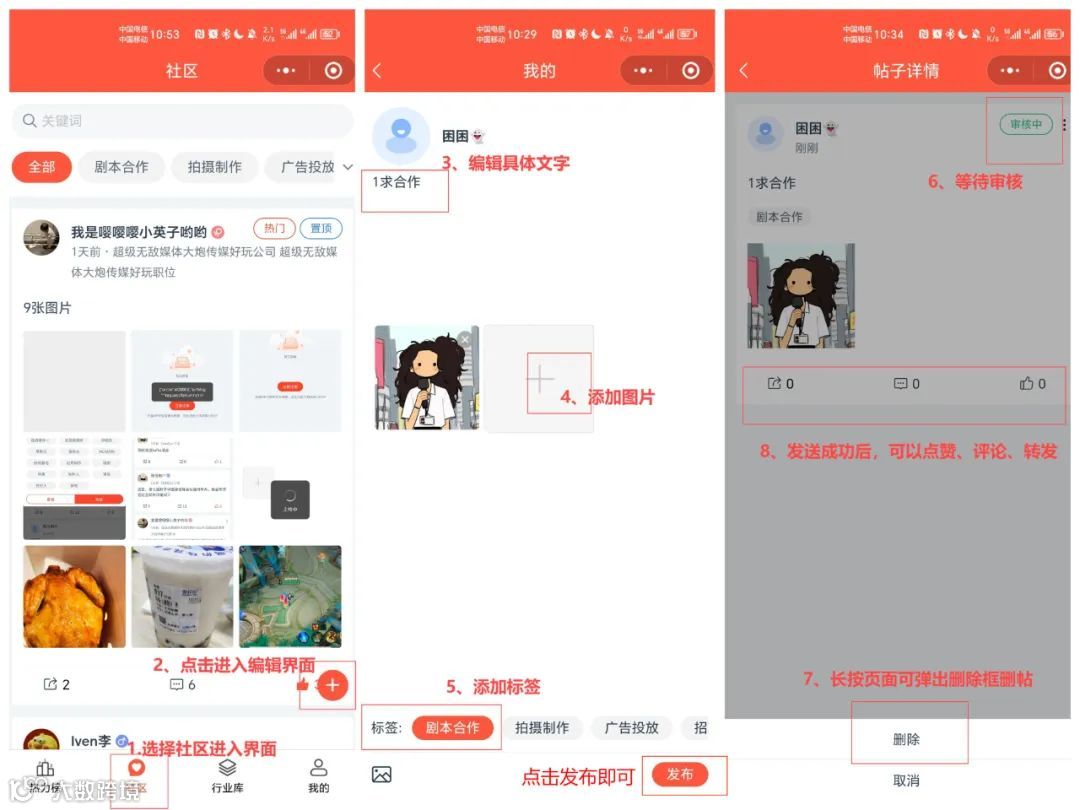 社区支持发布招聘信息、剧本合作、广告合作等内容。但需实名认证,且所发布信息须真实、准确、完整,禁止误导性内容。