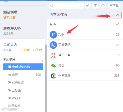 关键词设置的越详尽,监控采集到的内容将会越多越精确,几分钟后,我们通过图中的监控项目列表上方筛选数据源按钮,来设置只查看来自知乎的内容:
