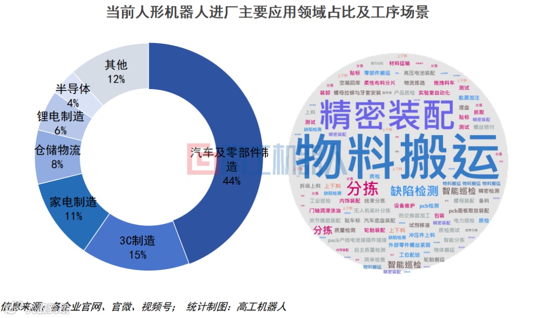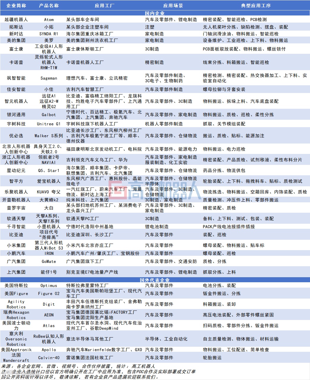 上述企业的人形产品主要聚焦汽车制造、3C电子、家电制造、仓储物流等工艺标准化程度高的领域。当前实际部署集中在搬运、分拣、上下料、装配、质检等工序。在VLA模型技术取得突破前,行业将从简单重复工序入手,逐步拓展至精细化操作。