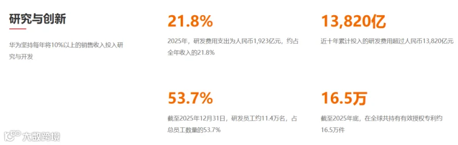 财报显示,华为研发投入再创历史新高,2025年研发投入达1923亿元,约占全年收入的21.8%,近十年累计投入的研发费用超过1.38万亿元。